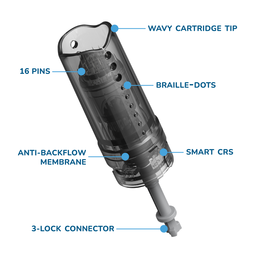 The cartridges are designed with a unique wave-like edge on the cartridge tip that prevents suction, and is widely spaced apart to reduce product buildup within the cartridge housing and noise. The design also makes for easier gliding and handling for effortless microneedling.