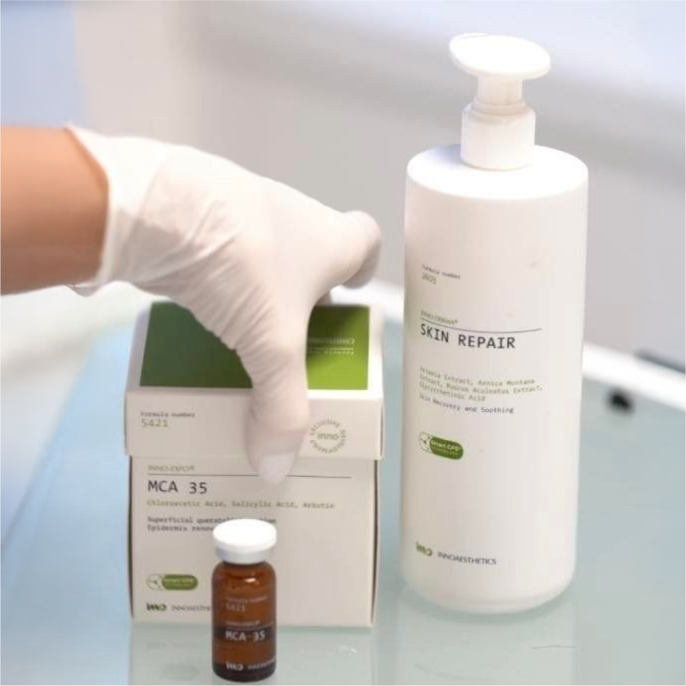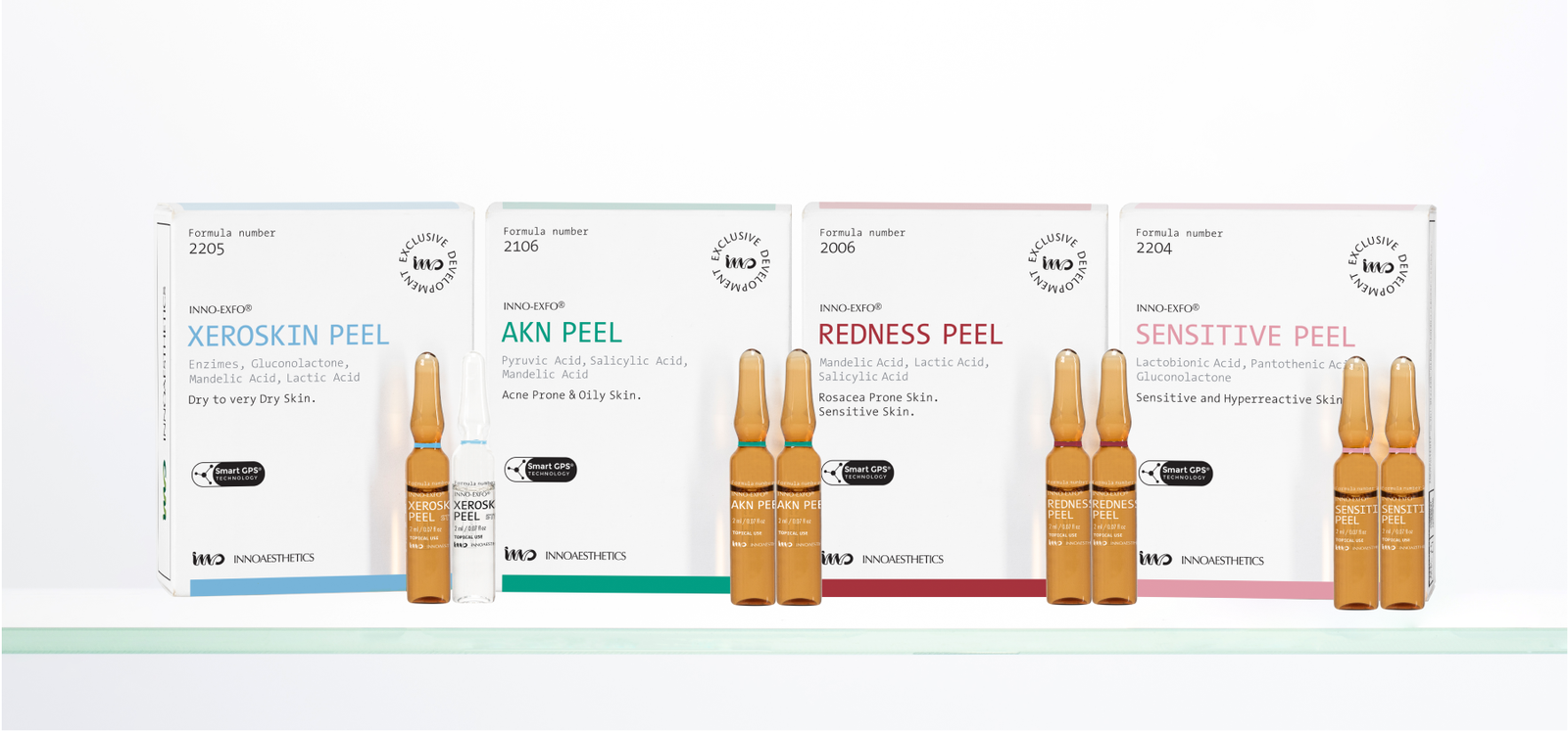 Shop Innoaesthetics' comprehensive chemical peel range combining various acids to address aesthetic concerns and specific skin pathologies.
