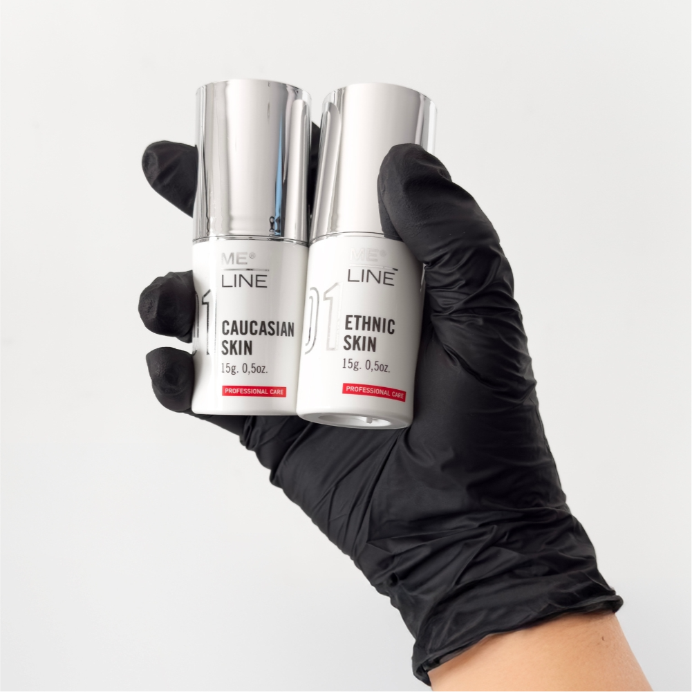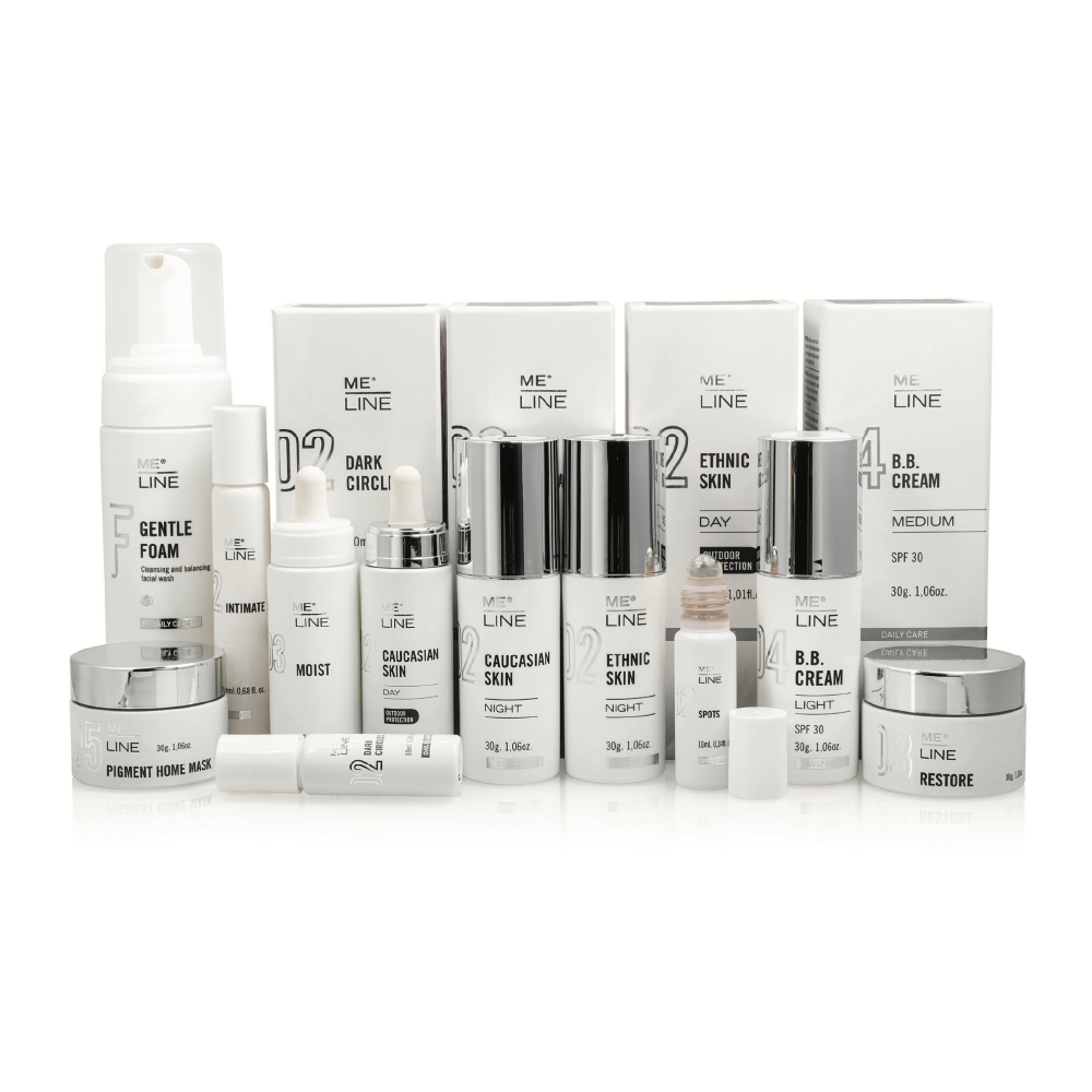 MELINE Treatments consist of unique formulations to treat different skin photo-types, with a caucasian formulation for photo-types I-III, an ethnic formulation for photo-types IV-VI, as well as solutions for specific body regions like the face, eyes, body, and intimate areas.