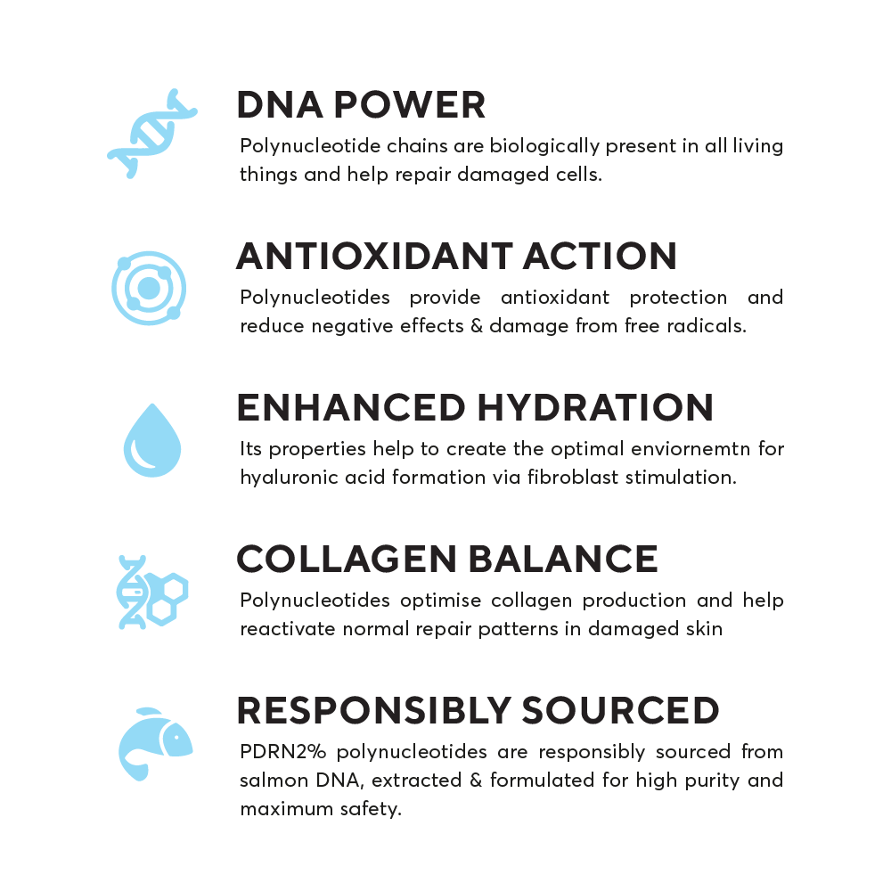 PDRN (PolyDeoxyRiboNucleotide) at a 2% concentration, formulated for skin rejuvenation. Indicated for expression lines, deep wrinkles, scars and marks, loose skin, volume loss, and photoageing. Suitable for application with microneedling technique. Shake well before use.