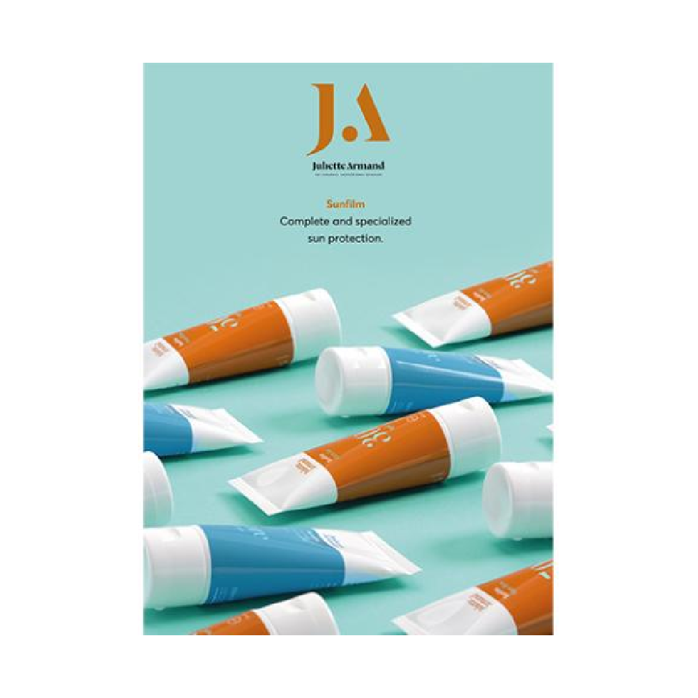 A hard foam counter card in A2 size displaying Sunfilm products; ideal to display in your treatment room, in your window or as part of your retail area. It has a cardboard stand at the back for displaying on shelves or countertops.